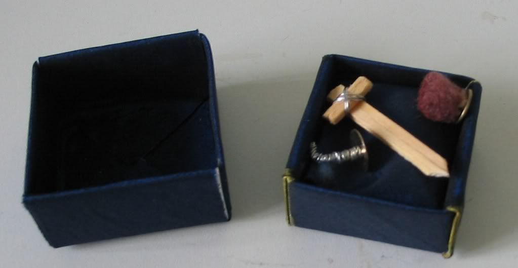 Edit: here are Gen's attachments in the box I am sending them in. There is a practice sword made of matchsticks, the 'wooden' hand and the hook. The falchion-style practice sword I made fell apart, which is why this one is so lame.